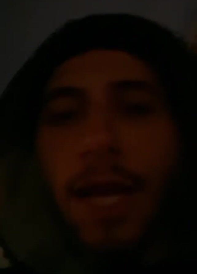 A person in a dark hooded sweatshirt is speaking into the camera. The camera briefly moves to show a person walking on a street with a decorated structure in the background. The person then looks up at the night sky. The camera returns to the person in the hood.