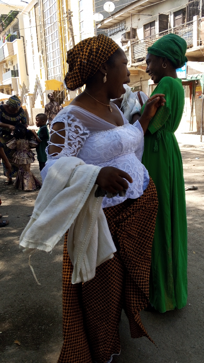 An outdoor street scene in Sabon Gari East, Nigeria, features two women interacting in the foreground
