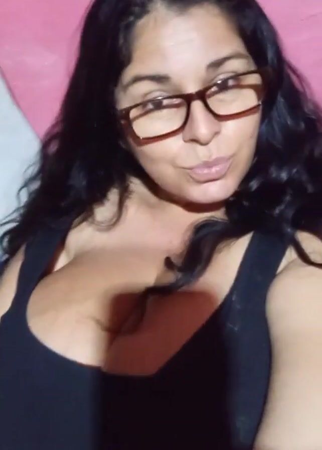 A woman with glasses and dark hair is looking at the camera and pouting. She is wearing a black tank top and has large breasts. The background is a pink and white wall. There is indistinct audio in the background.