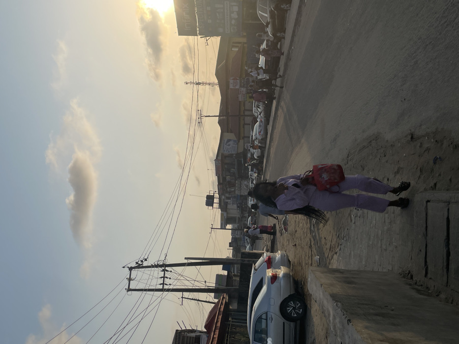 The image depicts a street scene in the city of Ado, Nigeria, at dusk or sunset