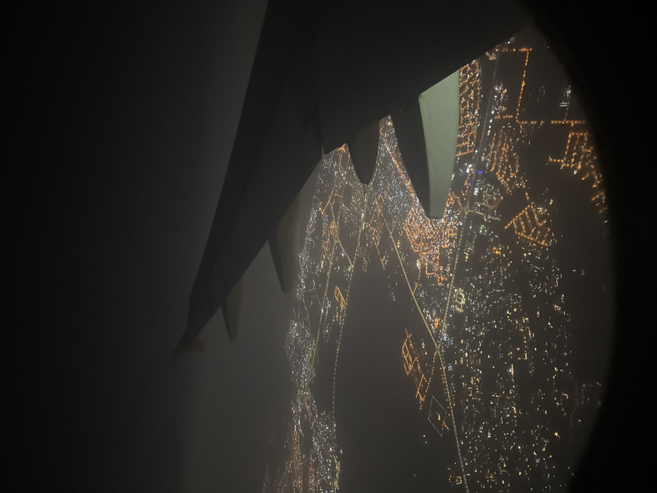 An airplane wing is visible through a dark, possibly fogged window. Below, a city sprawls with a dense network of illuminated streets, creating a vibrant display of orange and yellow lights. The city lights extend towards the edge of the window, partially obscured by darkness.