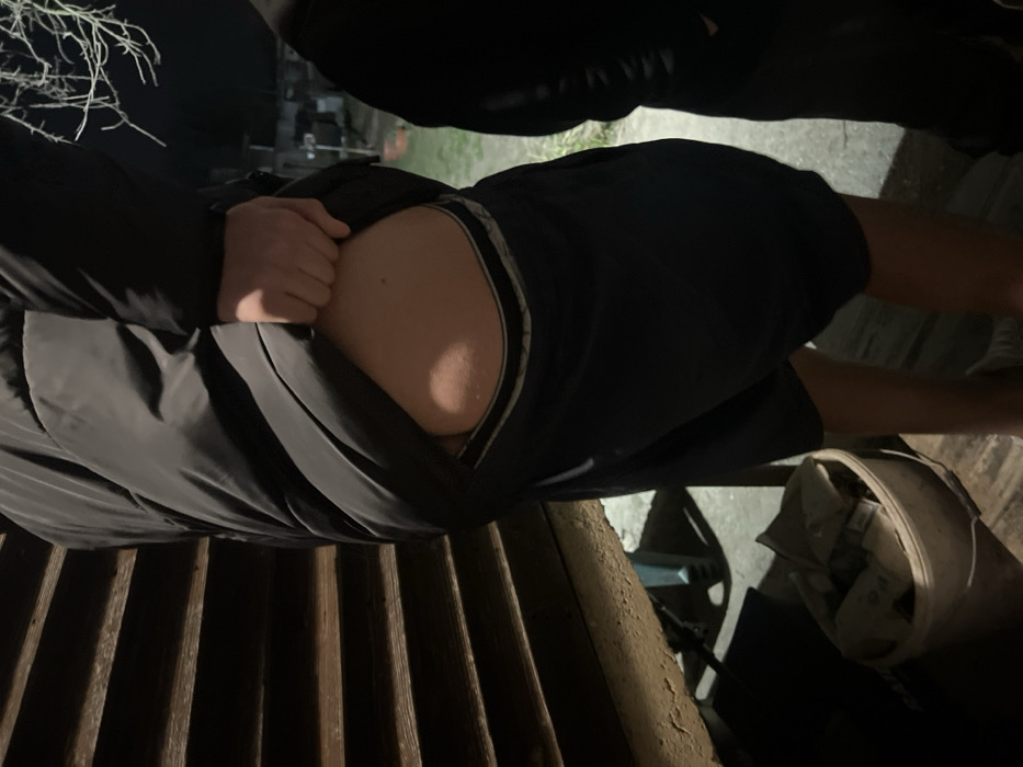 The scene is an outdoor, nighttime setting in Stolnik, Bulgaria. A central figure is depicted from the waist down, wearing a black puffer jacket and dark blue athletic shorts. The individual is observed pulling up their lower garments with their right hand, exposing the upper portion of their buttocks and the dark-colored band of their underwear, which features a light-colored stripe. A small, dark mole is present on the exposed skin. To the right, a second person is partially visible, clad in dark attire. The immediate background on the left consists of a dark, horizontally slatted wooden structure. Below this, a white plastic bucket containing assorted refuse is situated. The background on the right features sparse, bare tree branches against a dark, indistinct backdrop, possibly indicating distant structures. The ground appears as dark earth or sparse vegetation. The scene is illuminated by an unseen artificial light source.