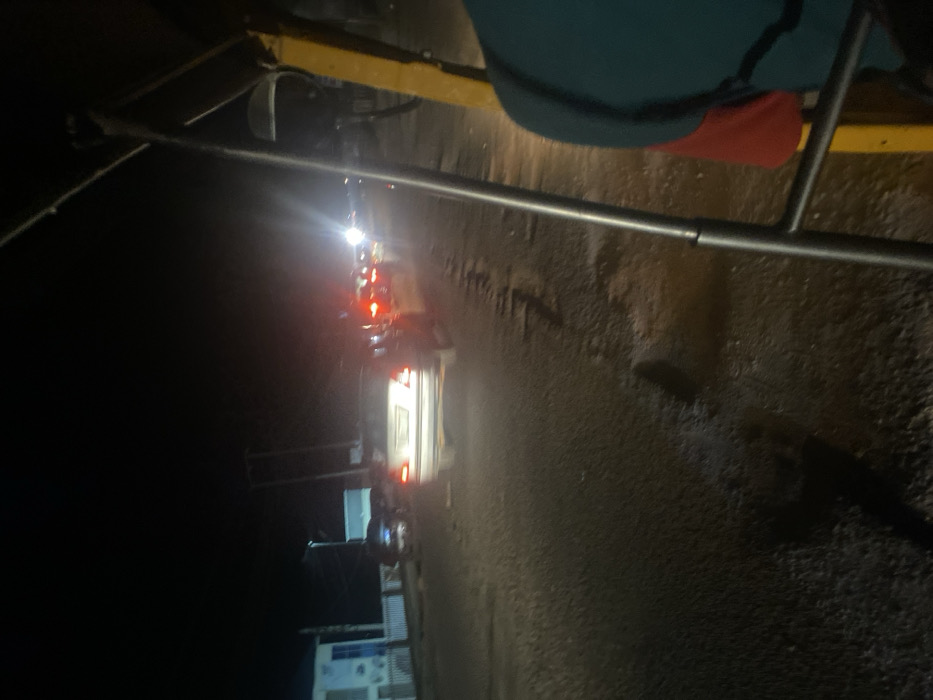 A nighttime street scene includes vehicles with illuminated headlights and taillights. Buildings line the street, with one displaying signage. A metal structure, possibly a frame or rail, is visible in the foreground. The scene is illuminated primarily by the vehicle lights and some building lights. The overall impression is that of a dimly lit urban setting at night.