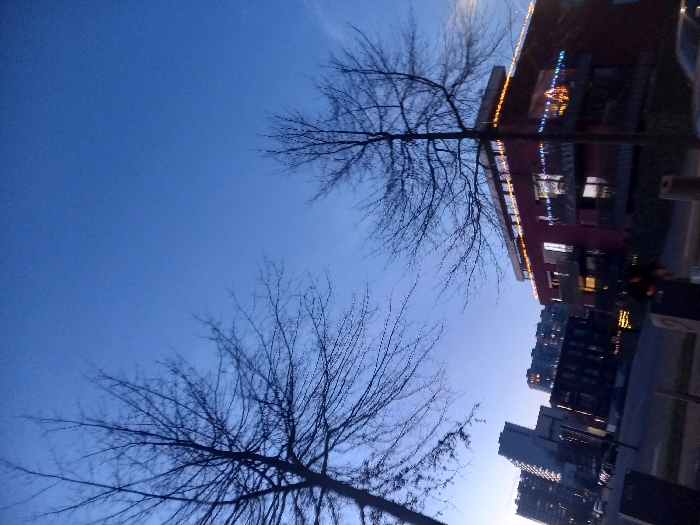 Two bare trees reach towards a vibrant blue sky transitioning to dusk, revealing city buildings. A tall red building with lights contrasts with darker structures in the background. A sidewalk and hints of street life add urban context to the scene.