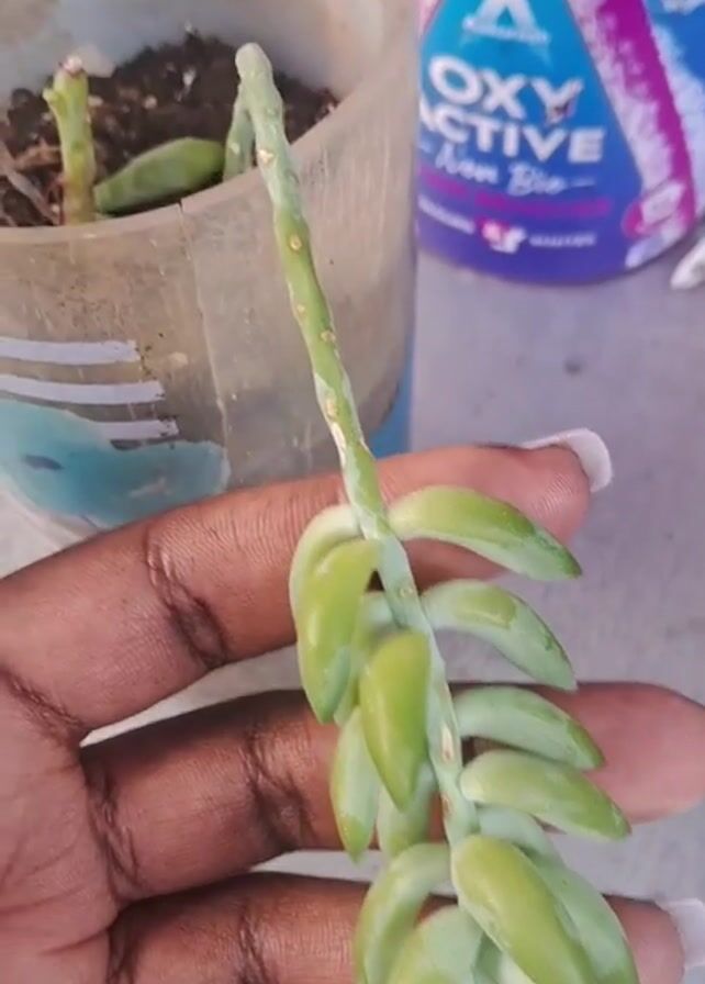 person holding a succulent plant stem with green leaves, displaying how to replant and propagate the plant