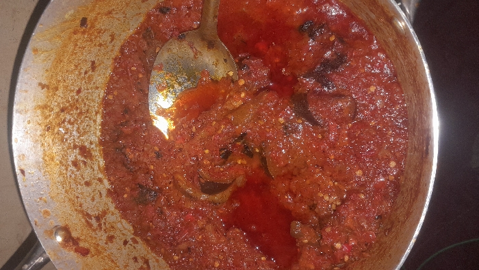 A pan contains a vibrant red sauce, speckled with seeds and flecks of spices