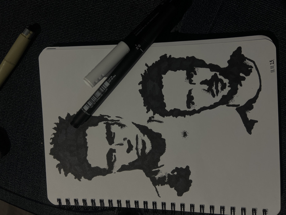 - "A sketchbook lies open, featuring two portrait sketches rendered in black ink with a pointillistic and abstract style" by FM-c63o33, licensed under CC BY 4.0