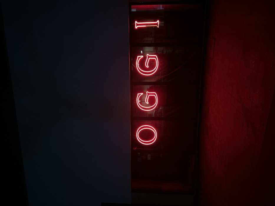 - "A red neon sign displaying the word "OGGI" is prominently featured against a dark building facade, likely a storefront, in Barcelos, Portugal" by FM-YH8cV2, licensed under CC BY 4.0
