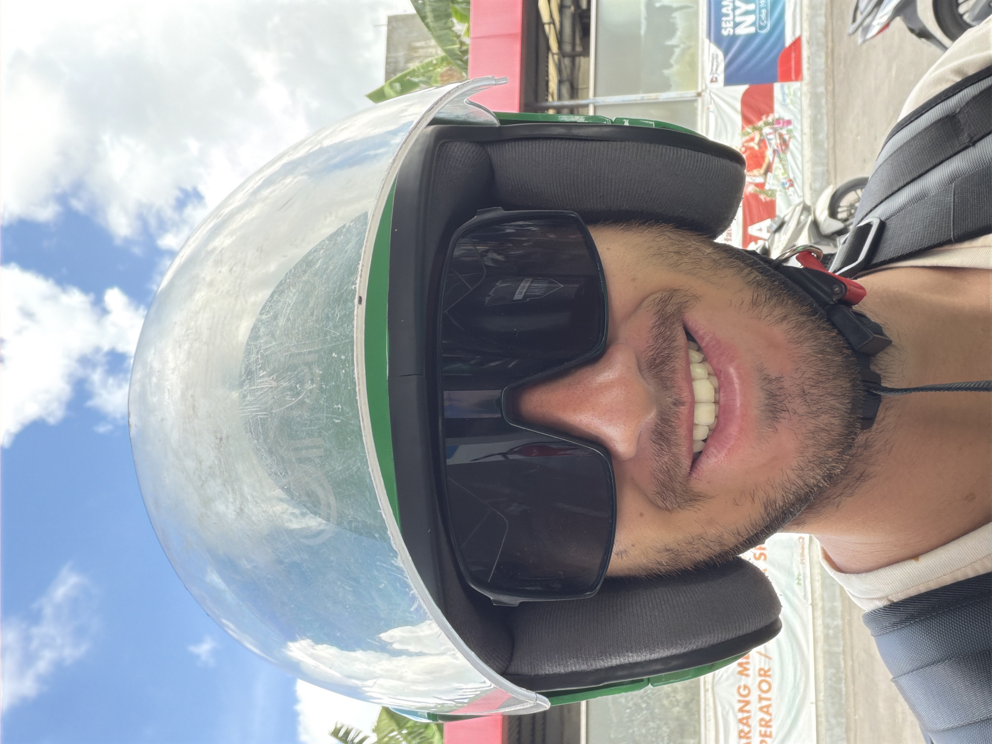 - "A medium-shot selfie depicts a man wearing a clear, full-face motorcycle helmet with a green trim, along with sunglasses, posing in what appears to be Kerobokan Kelod, Indonesia" by FM-RjPGA3, licensed under CC BY 4.0