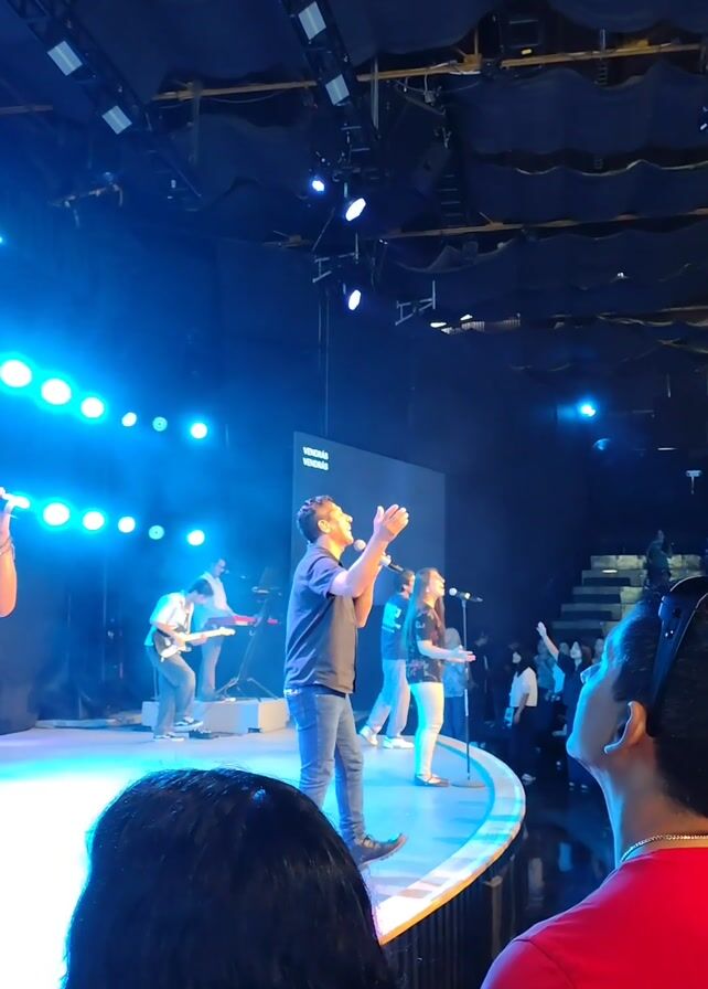 A Christian band is performing on stage in a large auditorium, illuminated by blue stage lights. The band consists of a male lead singer, two female backup singers, a guitarist, and a keyboard player. The lead singer, dressed in jeans and a dark shirt, is singing into a microphone with his eyes closed. The band is positioned on a circular stage, in front of a screen displaying the word "VENGA". The audience is visible in the background, looking up at the stage. Two audience members, one with dark hair and the other wearing a red shirt, are prominent in the foreground. The auditorium has a dark ceiling with visible lighting fixtures.