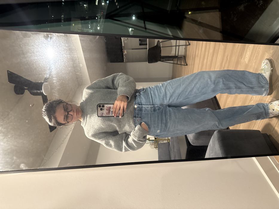 A woman stands facing a mirror, holding a phone with a floral case. She wears glasses, a gray sweater, and light blue jeans with paint-splattered sneakers. Reflected in the mirror is a sparsely furnished apartment. A black ceiling fan is visible near her head. The background shows a kitchen with bar stools, living room furniture, and a city skyline at night. The mirror frame is black.
