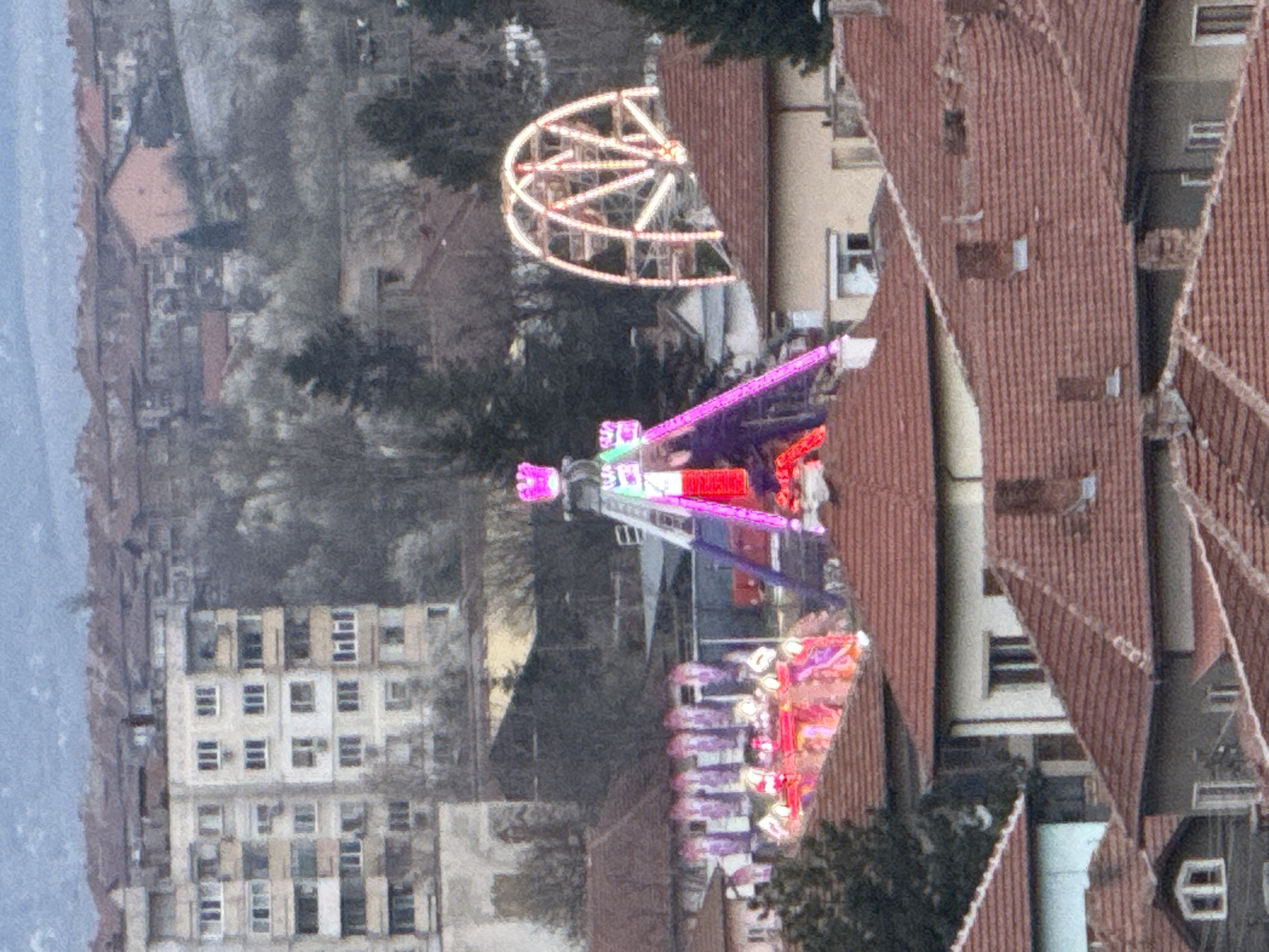 fairground with multiple rides, including a Ferris wheel and a tall spinning ride with bright lights, positioned in the city of Lovech, Bulgaria. The surrounding environment consists of residential buildings with distinct red tiled roofs and a large apartment building. The image exhibits a slightly overcast quality and is rotated.