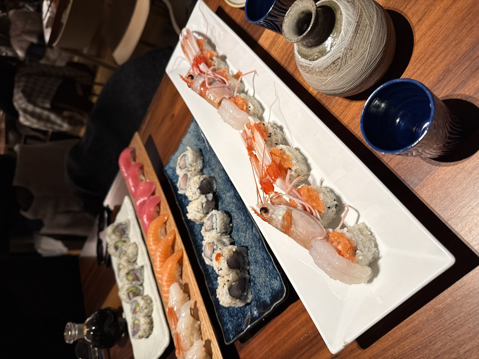 The scene depicts an upscale Japanese restaurant in Milan, Italy, characterized by a dimly lit, sophisticated ambiance. The foreground features a polished dark wooden table laden with various meticulously presented sushi and sashimi dishes. Dominating the central foreground is a long, rectangular white ceramic platter. It holds eight pieces of maki-style sushi, each topped with minced raw salmon. Artistically arranged on top of these sushi rolls are two whole, raw langoustines, positioned at opposite ends of the platter with their heads and antennae intact, pointing outwards. To the left of this central platter, a dark blue, textured rectangular ceramic plate displays seven maki rolls. Further back, on a light brown wooden serving board, are multiple pieces of nigiri sushi, including a row of eight salmon nigiri and five pieces of white fish or shrimp nigiri. Behind this board, another rectangular white ceramic platter presents six maki rolls, some with visible green fillings, while a smaller wooden board holds five pieces of red tuna sashimi or nigiri. Tableware includes a small, dark glass bottle with a stopper, likely containing soy sauce, situated in the upper left corner. In the lower right, two dark blue ceramic cups with textured exteriors and dark blue interiors are visible, accompanied by a beige stoneware carafe with a textured, horizontally striated surface, possibly for serving sake. The background is softly blurred, showing the indistinct forms of other dining tables, chairs with light-colored upholstery, and the presence of other patrons, indicating an active dining environment. No specific individuals are clearly discernible in the immediate foreground.