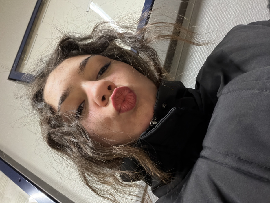 A young woman with wavy brown hair puckers her lips in a selfie. She wears a black jacket zipped up to her neck. The image is tilted, with the woman's head angled towards the lower left corner. In the background, a wall with a blue-framed window is visible. The lighting is diffused.