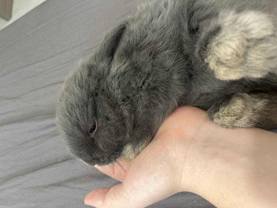 This image depicts an indoor scene in Turin, Italy. A small, grey-furred rabbit is observed lying on its back or side, partially cradled by a human hand. The rabbit exhibits short, dense grey fur, with lighter, mottled beige or brownish-grey fur visible on its underside and paws. Its right eye is partially visible, appearing dark. The ears are not distinctly visible, suggesting a lop-eared type, flattened against its head. The human hand, of fair complexion, extends from the lower left of the frame, providing support beneath the rabbit's head and upper body. The background consists of a plain, light grey textile surface, consistent with bedding or upholstery. No other subjects or objects are discernible within the frame.