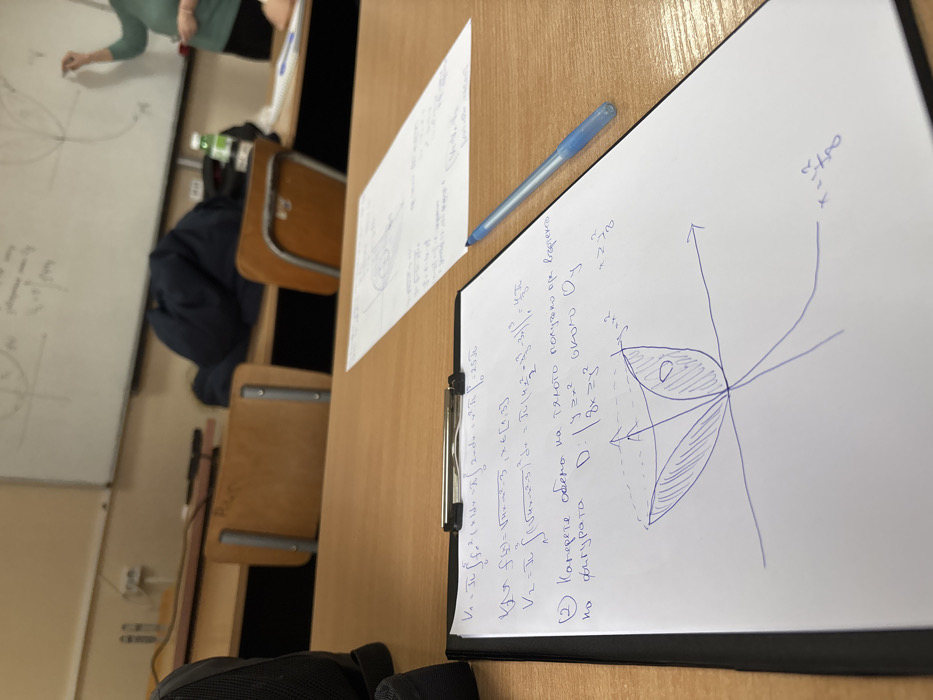 The image displays an indoor classroom or lecture hall within an educational institution in Sofia, Bulgaria. In the immediate foreground, a light brown wooden desk holds a black clipboard with a white sheet of paper containing handwritten mathematical equations and a 3D graph drawn in blue ink. The text on the paper is in Bulgarian Cyrillic, specifically detailing calculus problems involving integrals and volume calculations. A light blue ballpoint pen rests on the desk to the right of the clipboard, with another sheet of paper showing additional handwritten content further right. A black bag or backpack is partially visible on the far left of the desk. In the midground, multiple light brown wooden desks and chairs are arranged in rows; one desk holds a folded dark blue jacket and a green plastic bottle. In the background, a large white whiteboard is mounted on a wall, covered with mathematical equations and graphs written in black marker. A person, partially visible from the chest up and wearing a light teal-colored top, stands to the right of the whiteboard, holding a marker and actively writing or presenting content on the board. The scene suggests a mathematics class or lecture in progress.
