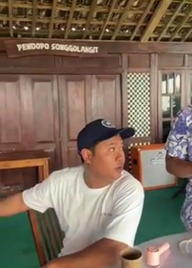 n indoor scene at a gathering of people. Two men are visible at the start, one wearing a blue baseball cap and a white T-shirt, and the other wearing a purple floral shirt, handling a charger and a portable fan on a table. The scene then pans to show several other people sitting at tables, including young children and teenagers, inside an open-air structure with a wooden roof. A woman wearing a pink hijab and floral dress is also seen, standing with her arms raised in a welcoming gesture. The location is marked with a sign that reads "PENDOPO SONGGOLANGIT."