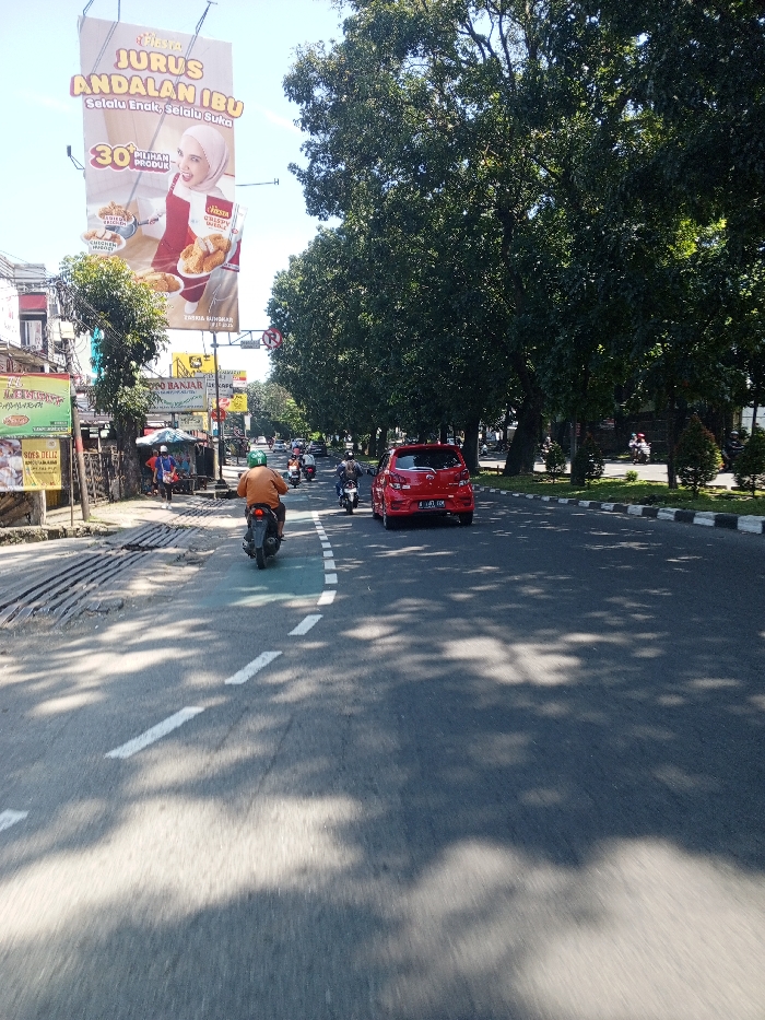 The scene depicts a daylight street view in Multhan, India, looking down a multi-lane asphalt road. The sky is clear blue, and bright sunlight casts dappled shadows from numerous large trees across the roadway. In the foreground, a person wearing an orange shirt and a green helmet is operating a black motorcycle, traveling away from the viewer in the left lane. Ahead of the motorcycle and to its right, a red compact car with license plate "A 1843 ECA" is also moving away from the viewer in the right lane. Further down the road, additional motorcycles and what appear to be other vehicles are visible in both lanes. A continuous dashed white line separates the lanes, with a green-painted strip on the far left of the road segment adjacent to the sidewalk. To the left of the road, a sidewalk runs alongside various commercial structures. A prominent billboard displays "JURUS ANDALAN IBU" (Mother's Signature Move) and "Selalu Enak, Selalu Suka" (Always Delicious, Always Loved) with "FIESTA" branding, featuring a woman in a hijab and red apron presenting fried chicken products. Below this, several smaller signs and a light blue canopy are visible, along with a few pedestrians on the sidewalk. Utility poles and overhead wires are present on this side. To the right of the road, a grassy median strip lined with dark-trunked, dense-foliage trees extends into the distance. A "No Entry" traffic sign (red circle with a white bar) is affixed to a pole on this side.