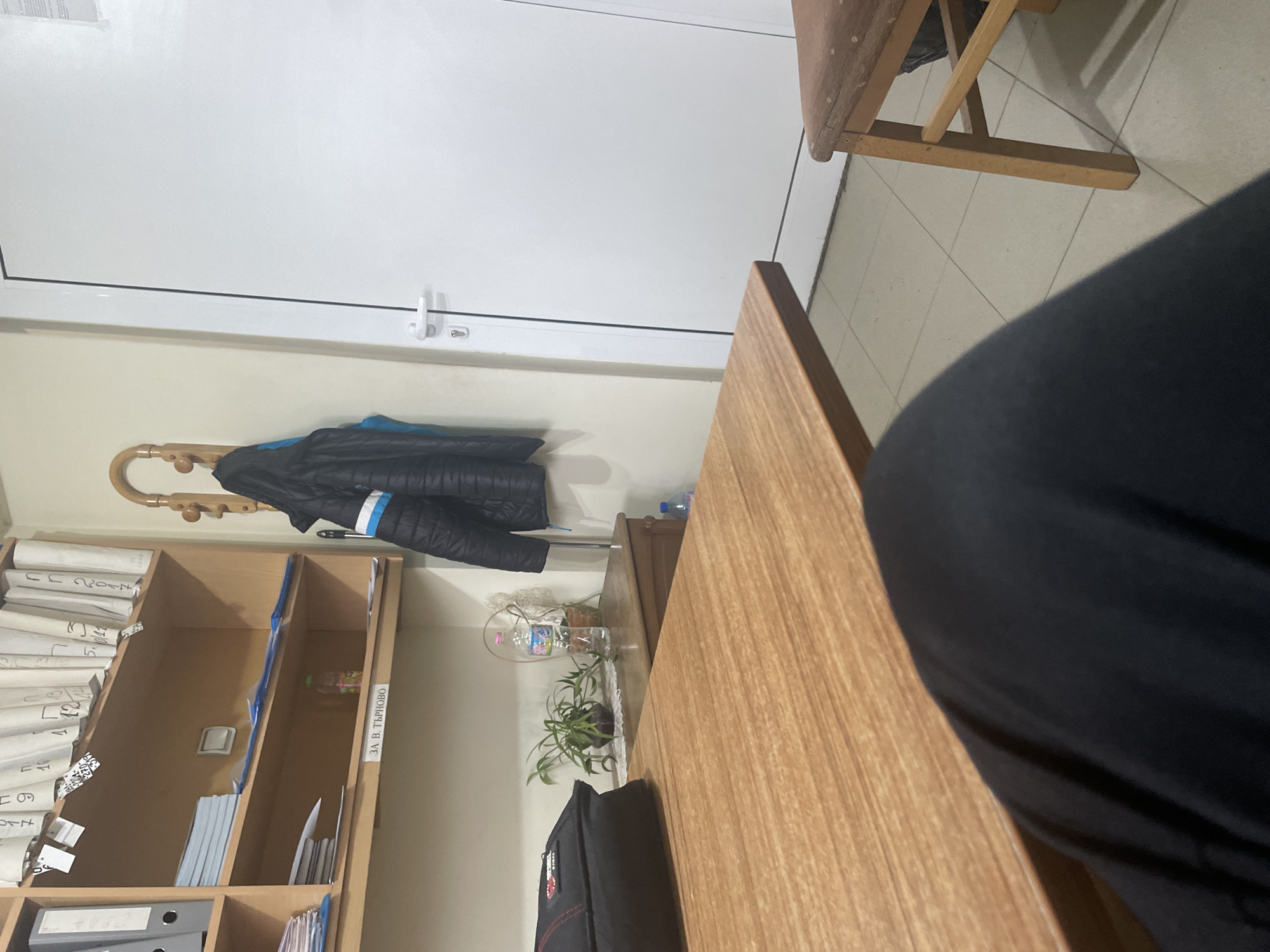 The image depicts an indoor scene, possibly an office. A wooden desk occupies a significant portion of the foreground, with a person's black garment visible to the right. A bookshelf is attached to the wall. The shelf contains documents and folders. A blue and black jacket hangs on a wooden coat rack mounted on the wall. On top of the desk, there is a plant in a glass container next to a plastic water bottle. A white door with a handle is also visible. The writing on the shelf indicates it is located in V. Tarnovo.