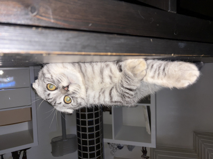 - "A silver tabby Scottish Fold cat with large, luminous yellow eyes and dilated pupils is depicted lying on its left side on a dark wooden surface" by FM-xlahD2, licensed under CC BY 4.0