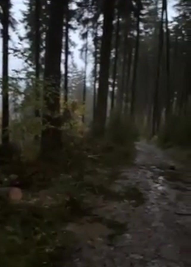 dark, overcast forest with tall, straight trees. A dirt path runs through the scene, wet with moisture. There are some cut logs visible on the hillside. The overall impression is of a somber, possibly misty, atmosphere in a woodland environment. The camera shakes from time to time.
