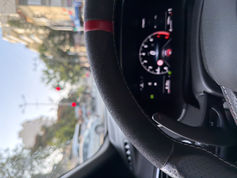 The image captures a driver's perspective from a stationary vehicle on an urban street in Kfar Saba, Israel, during daylight. In the foreground, a black steering wheel with a textured surface, a red vertical stripe at the 12 o'clock position, and white stitching is prominent. A dark paddle shifter is visible behind the left side of the steering wheel. Below, a digital instrument cluster is partially displayed, showing a '0' speed reading, multiple green indicator icons, and a red warning symbol, with a partial odometer or trip meter reading. Through the windshield, the midground reveals a street with multiple out-of-focus vehicles stopped in traffic. Two distinct red traffic lights are visible ahead, indicating a halt. The background consists of multi-story buildings characteristic of an urban environment, interspersed with trees and streetlights under a bright, clear sky. No individuals are visible.