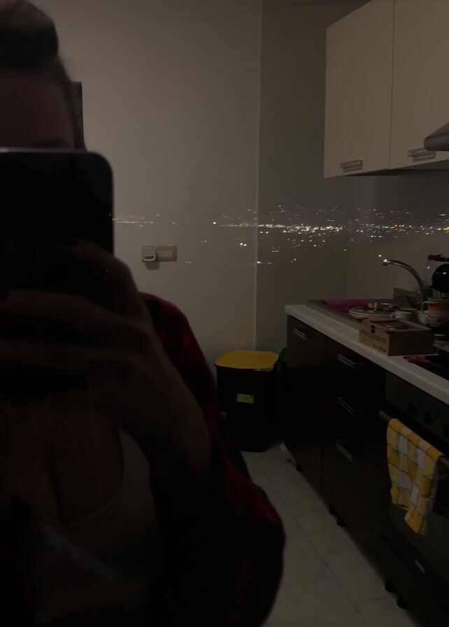A dimly lit room shows a person taking a selfie in a mirror. The person has short hair and is wearing a red and black plaid shirt over a light-colored top. A black smartphone is held up, obscuring the person's face. The background shows a kitchen with white upper cabinets and dark lower cabinets. A sink is visible, along with various items on the countertop. A yellow trash can sits beside the cabinets. Through a window, a cityscape with numerous lights is visible in the distance. The overall lighting is low, contributing to a muted atmosphere.