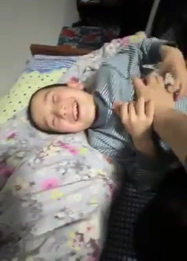 A video shows a child lying on a bed being tickled by another person