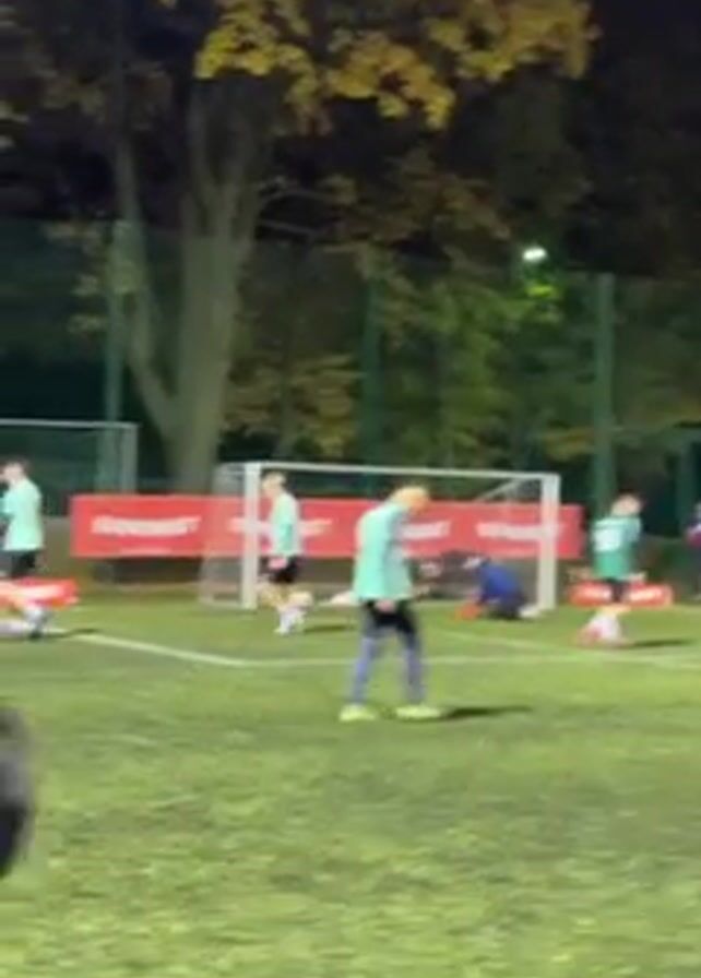 soccer match at night on a green field. The field is lined with white stripes and bordered by a net. There is a red and white banner behind the goal. In the background, there is a large tree with green leaves. There are about ten players, mostly wearing green or blue jerseys. One player is wearing a yellow and black jersey. After a shot, one person is lying on the ground in front of the net. Someone shouts, "Horosh!" which translates to "Good!" in English.