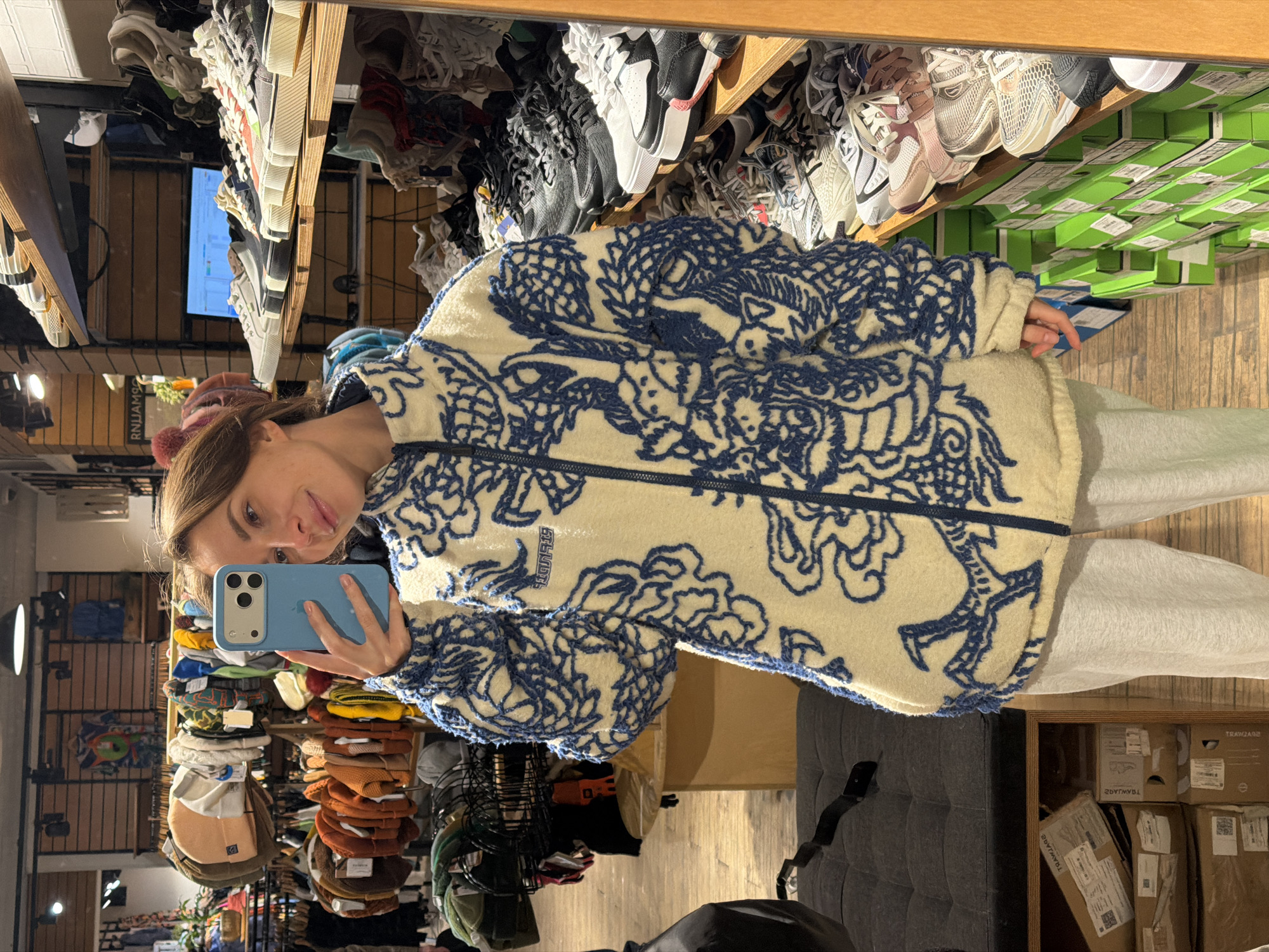 A young adult female with light-colored skin and medium brown hair is depicted in a retail store, identified as TRAWA in Moscow, Russia, likely at its Pokrovka Street location. She is capturing a mirror selfie using a light blue smartphone held in her right hand, subtly smiling towards the camera. The subject is wearing a cream-colored fleece jacket adorned with intricate blue embroidered patterns, which appear to be stylized dragons or mythological creatures, and light grey sweatpants. The background reveals a well-lit interior of a streetwear or sneaker boutique. To the subject's left, various items of apparel, including beanies and jackets, are displayed on wooden racks and shelving units. To her right, numerous pairs of sneakers and casual shoes are meticulously arranged on wooden shelves. Below these shelves, stacks of vibrant green shoe boxes are visible. In the lower left foreground, a dark grey upholstered bench or ottoman is partially visible, with a black strap resting upon it. Cardboard shipping boxes are stored underneath a wooden display fixture. The flooring appears to be made of wood planks. Reflected text, including "ЯНАШЛА" and "TRAWA," provides contextual clues about the store's branding and name.