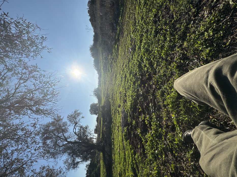The image presents a ground-level perspective from a seated or reclined individual located in the Menashe Regional Council, Israel. In the foreground, the individual's olive-green pant-clad legs are extended, with a dark left shoe visible. The immediate ground consists of patchy green grass and exposed dark soil, intermingled with scattered small rocks. The mid-ground and background reveal a gently sloping, open landscape characterized by vibrant green ground cover and several trees. A prominent olive tree stands on the left side of the frame, with its canopy visible. The upper portion of the image is partially framed by the bare branches of another tree. The sky is clear blue, featuring a bright, star-like sun radiating strong light in the upper right quadrant, indicating daytime. Distant vegetation and a small, light-colored structure or container are discernible on a distant rise.