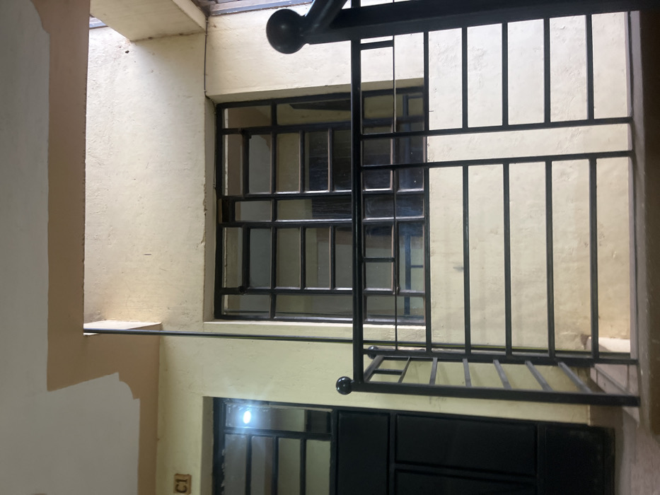 A narrow, interior courtyard with barred windows and a black metal staircase. The walls are a pale yellow. One window is square with multiple small panes. Below it, a dark door is visible. Light enters from above, illuminating the courtyard. A "C1" marking is on the wall near the door. The staircase partially obscures the upper window.