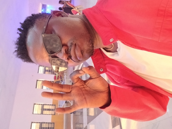 A man with dark hair and sunglasses makes an OK hand gesture. He wears a red jacket over a white shirt and a gold chain. He is inside a building with windows along a wall. Other people are visible in the background. The photo is taken from a low angle, looking up at the subject.
