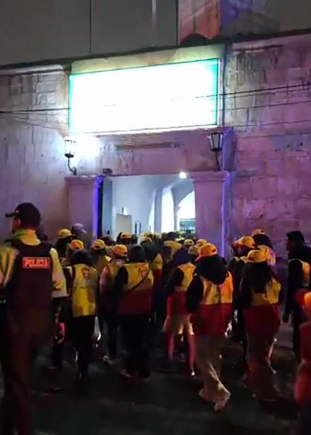 At night, a crowd of people wearing yellow caps and red and yellow vests gather outside a building. Many of the people in the crowd appear to be looking up at a sign above the entrance of the building. The sign is illuminated with turquoise light and reads “POLICIA NACIONAL DEL PERU, COMISARIA PNP, PALACIO VIEJO”. Several people, who appear to be police officers, are on the perimeter of the crowd. A car is parked to the left of the frame. The building is made of stone. Two antique-style lanterns flank the sign. The video appears to be shot from street level and is handheld.