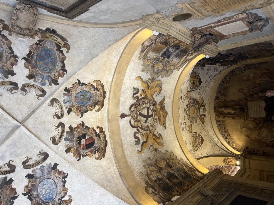 The image depicts the interior of a vaulted corridor or hall within the Archiginnasio of Bologna, Italy. The ceiling is segmented by structural ribs, forming a series of vaults rendered in a light, off-white hue. Thousands of painted coats of arms, associated with student "nations" and professors, adorn these vaults. Examples visible include "LOMBARD," "PEDEMONTAN," and "ROMANDIOLI," dated with numbers like "21," "22," "23." Each coat of arms is typically an escutcheon framed by elaborate decorative scrolls and ribbons, some containing specific dates and names like "D. MARCUS ANTONIUS FRANZONUS NOG" and "D. PETRUS BAPT. ROGA... ASTEN." A prominent central vault features a large, ornate coat of arms with a white shield bearing a black cross, flanked by golden, stylized foliage. Below the upper vaults, painted arches separate additional decorative elements and frescoed scenes. Artificial yellow light illuminates the lower sections of these arches, highlighting painted figures and architectural motifs in darker tones. At the far end of the visible corridor, a deep archway reveals a niche containing a white, robed statue of a figure, possibly a scholar or saint. Below the statue, frescoes depict multiple figures in historical or religious garb, rendered in muted colors. On the right wall, a large, rectangular marble plaque with engraved Latin text is mounted, adorned with carved decorative elements. Above it, a smaller, similarly framed plaque is partially visible. At the bottom center of the frame, a person's head and upper face are partially visible, showing grey hair and looking slightly upwards. The individual's presence indicates human scale within the historic environment. The overall lighting is dim, augmented by warm artificial illumination on specific architectural details and frescoes.