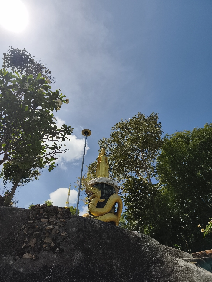 A low-angle shot captures a golden Buddha statue atop a rock formation, framed by trees and a bright sky with the sun shining. A golden serpent coils around the base of the statue. A lamppost rises behind the statue. The blue sky is dotted with scattered clouds. The foreground features the rough texture of the rocks, while the background is filled with lush green foliage.