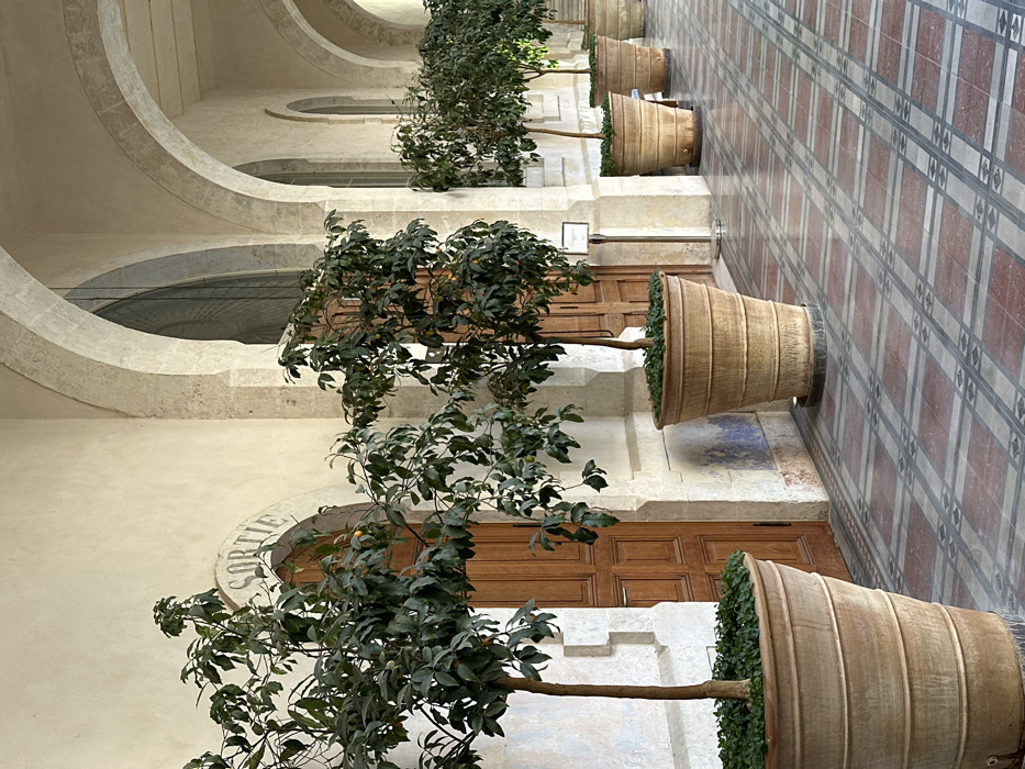 The image displays a cloister or covered walkway, identified as being within St. Peter's Church in Old Jaffa, Tel-Aviv, Israel. The scene features a light-colored, textured wall to the left, incorporating at least two arched wooden panel doors. Above the leftmost door, the word "SORTIE" is inscribed within its arch. A row of at least five identical, large, ribbed, light brown terracotta-style planters extends along the wall. Each planter contains a small, leafy tree with dark green foliage and small, yellowish-orange fruits, consistent with kumquat trees. The base of each tree in the planter is covered with green groundcover. To the right, a sequence of light-colored stone arches forms a colonnade, receding into the background. The floor is covered with a distinctive patterned tile mosaic featuring red squares interspersed with grey and white geometric bands. A single, small, silver-colored sign stand with an unreadable placard is positioned on the tiled floor between the second and third planters from the left. No individuals or animals are present.