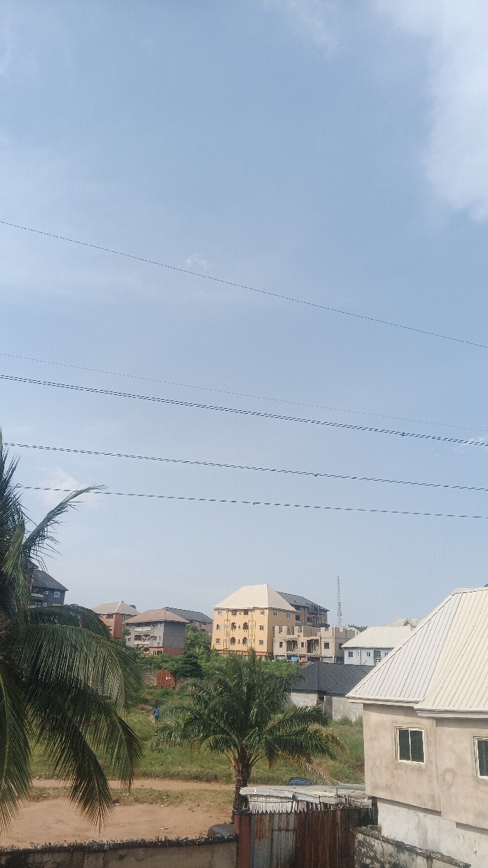 The image captures an urban landscape in Onitsha, Nigeria, under a mostly clear, light blue sky featuring faint cirrus clouds