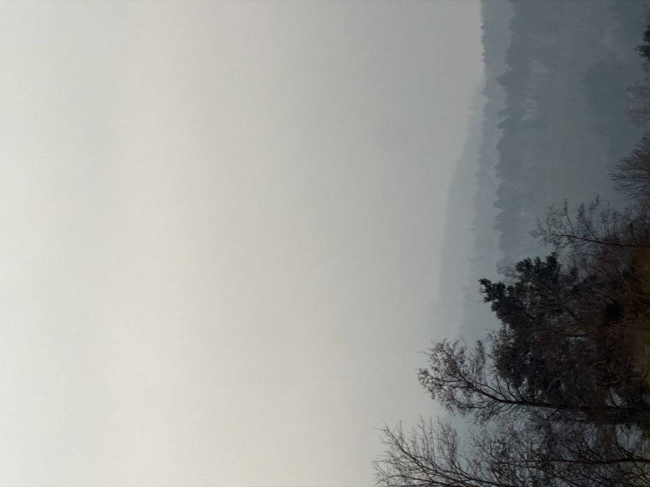 The image depicts a hazy, overcast, and possibly foggy landscape within Illkirch-Graffenstaden, France. The upper two-thirds of the frame are occupied by a uniform pale gray sky or atmospheric haze. In the foreground, primarily on the left side, are the dark silhouettes of several bare deciduous trees and some coniferous trees with visible foliage. Their branches are starkly defined against the muted background. Beyond these immediate trees, a series of receding forested hills or undulating terrain extends into the midground and background. These distant tree lines and landforms appear increasingly blurred and desaturated, fading into the ambient gray haze, exhibiting atmospheric perspective. No human figures, specific structures, or discernible actions are present.