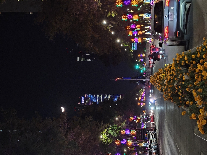 A nighttime photograph captures a multi-lane urban thoroughfare, identified as Paseo de la Reforma in Mexico City, Mexico. The central median of the boulevard is densely planted with numerous vibrant orange marigold flowers. Vehicles, including a light blue SUV positioned in the right foreground, several cars, motorcycles, and a red double-decker bus, are in motion across the visible traffic lanes. Both sides of the boulevard are lined with trees adorned with extensive, multi-colored illuminated decorations, resembling ornate lanterns and geometric patterns. In the background, several tall modern skyscrapers are visible, with the BBVA tower prominently displaying its illuminated blue logo on its facade. A distinct crescent moon is visible in the dark night sky above the buildings. Traffic lights are operational further down the street.