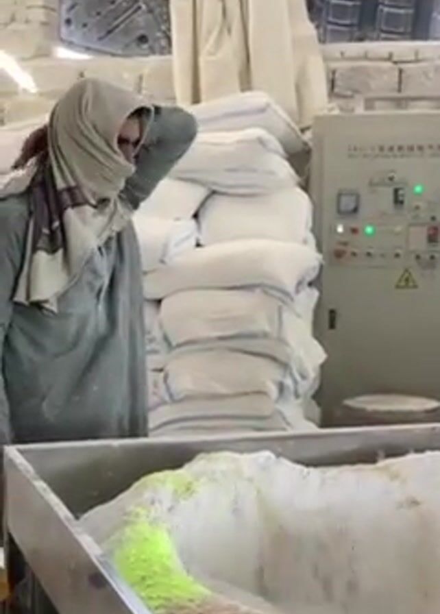 A man stands next to a large, square, stainless steel mixing tank. The tank contains a white powdery substance, mixed with green and brown materials. The man is wearing a light green tunic and a white headscarf, partially covering his face. He adjusts the headscarf. To the right of the tank is a gray electrical control panel. Behind the tank and the man, there's a stack of large white bags. The room appears to be a workshop or industrial setting, with exposed brick walls and other industrial equipment visible in the background.