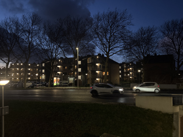 - "This image captures an urban street scene in Spijkenisse, Netherlands, during the evening or night hours, characterized by a dark blue sky with visible clouds and artificial illumination" by FM-gAhQb2, licensed under CC BY 4.0