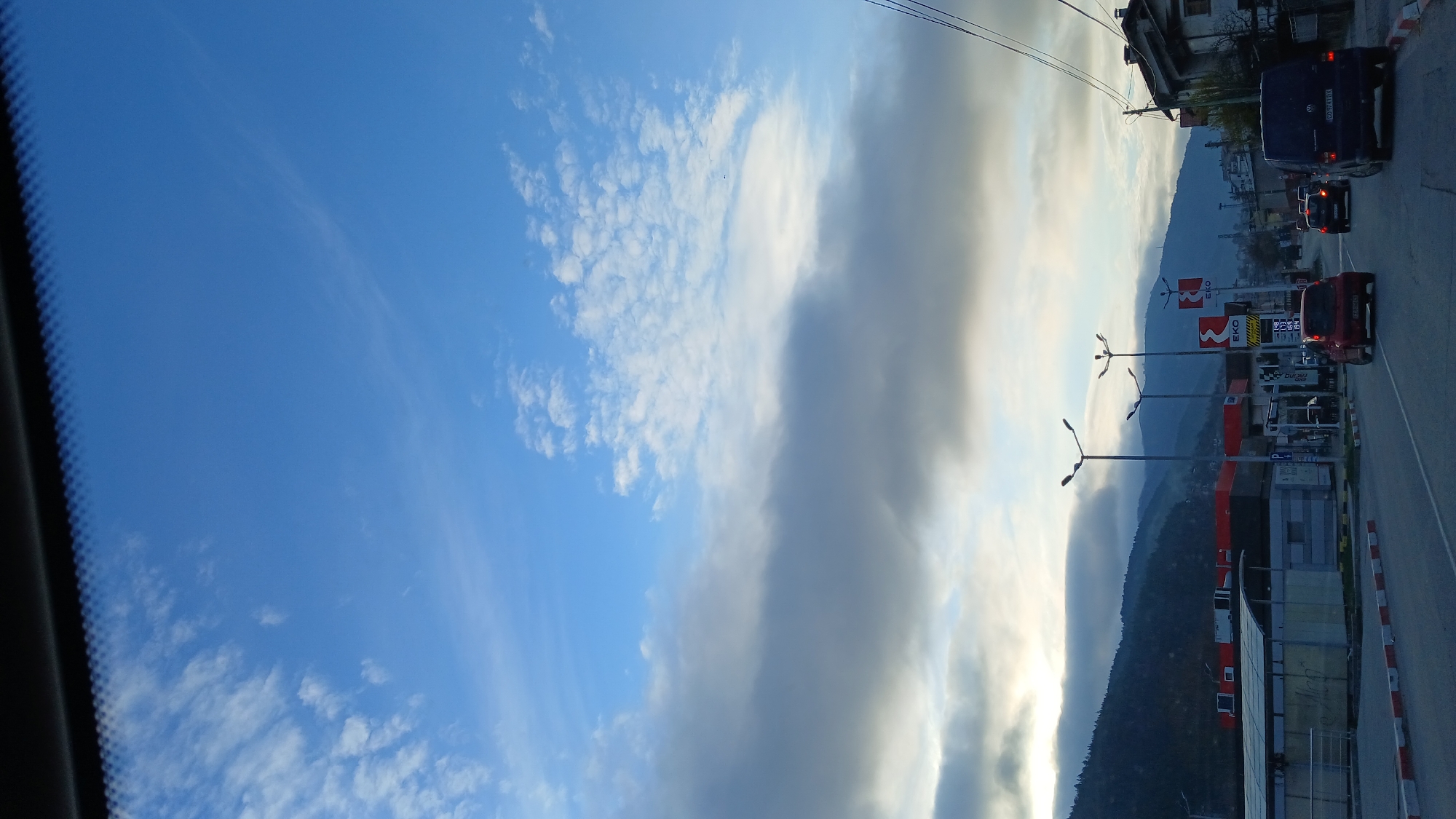 The image captures a scene in Svoge, Bulgaria, seemingly taken from inside a vehicle, possibly a car. The sky occupies a large portion of the image, displaying a mix of blue skies and various cloud formations, including cirrus and cumulus clouds. On the right side of the frame, a roadside view unfolds, featuring an EKO gas station with its characteristic signage and gas pumps. Several cars are visible on the road adjacent to the gas station. A mountain range is noticeable in the background, partly obscured by clouds. Streetlights line the road. Buildings are visible, including a section of a building in the upper right corner.