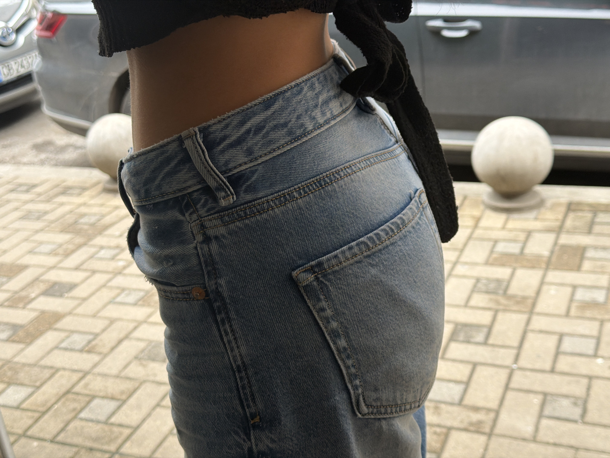 A close-up shot shows a person wearing light-wash jeans with a black garment tied at the waist. The jeans have a visible back pocket with stitching detail, and the waistband is prominent. In the background, there is a grey car parked on a paved area, with two spherical bollards visible behind the car. The paved area appears to be constructed of light-colored stone blocks. The location appears to be in an urban setting, likely in Sofia, Bulgaria, based on the car license plate visible in the background.