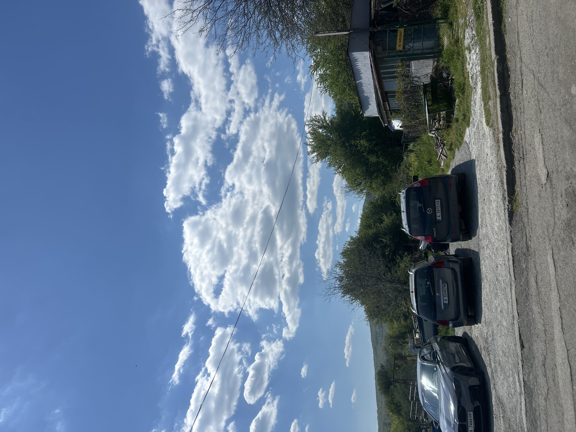 The image depicts a partially obstructed view of a section of Tsarevo, Bulgaria. Three cars are parked on an asphalt road, partially obstructing the view of a building and surrounding vegetation. The license plates are visible: A 7444PP, A 5540PN, and A 3415HA. Overhead, a bright blue sky is punctuated by white cumulus clouds.