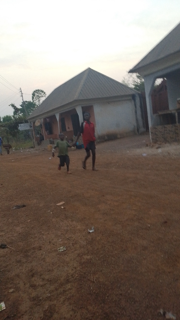 Two barefoot children, one in red and one in green, run across a brown, dirt-covered ground. A building with a gray roof stands behind them. Another building is visible to the right. Litter is scattered on the ground. The sky is overcast. A utility pole and some trees are visible in the background.