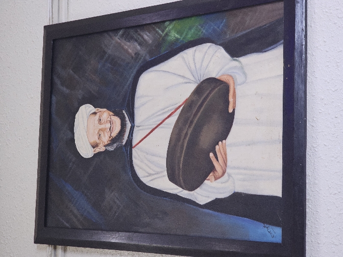 A framed painting portrays a smiling man wearing a white turban and white robe