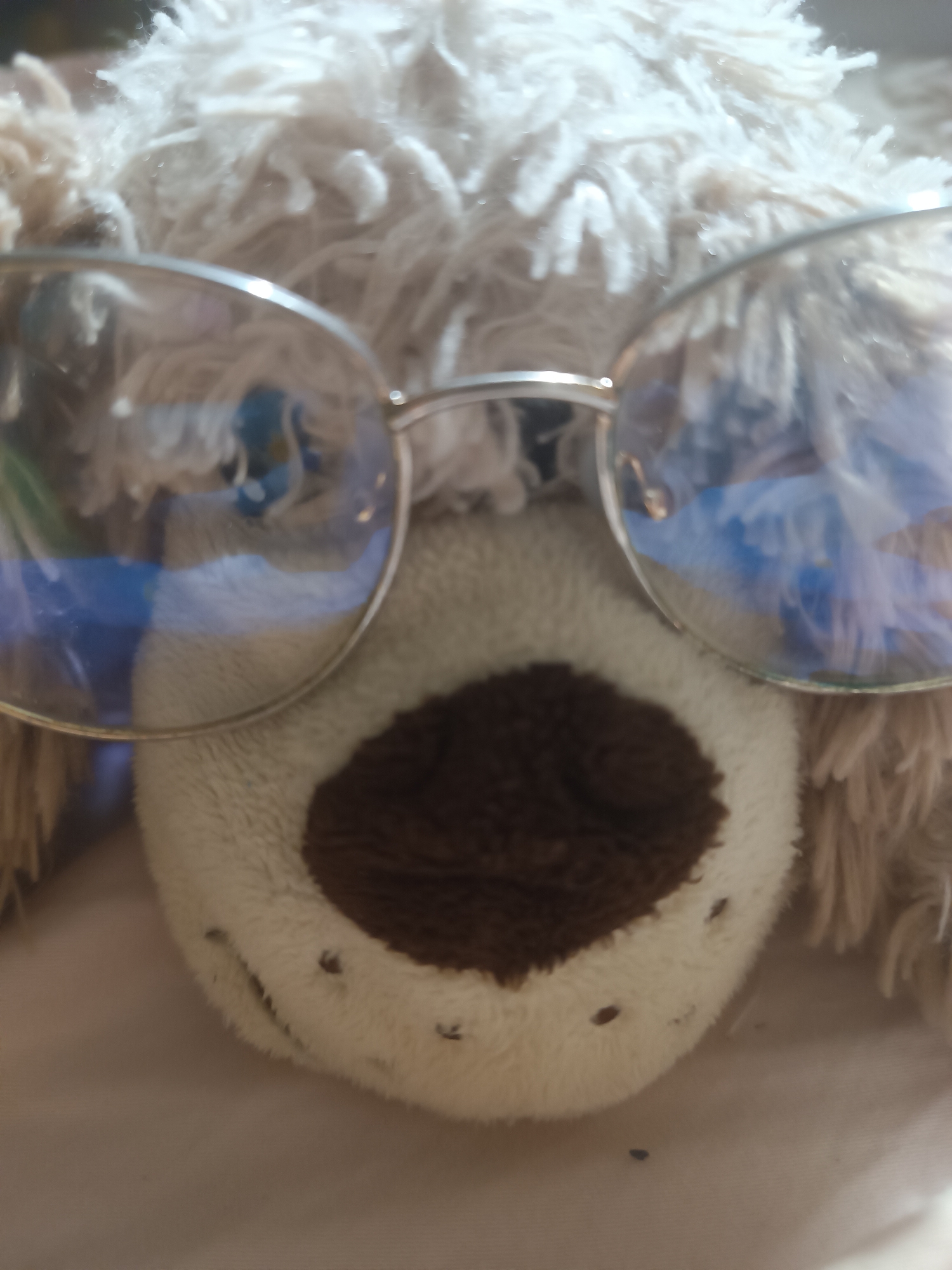 A close-up shot focuses on a stuffed animal dog with fluffy, off-white fur. The dog is wearing a pair of eyeglasses with thin, silver frames. The glasses have clear lenses with reflections visible. The dog has a prominent, brown, oval-shaped nose. There are a few dark spots or markings near the lower part of its face. The background is blurry and suggests a light-colored surface. The location information is not determinable based on the image.