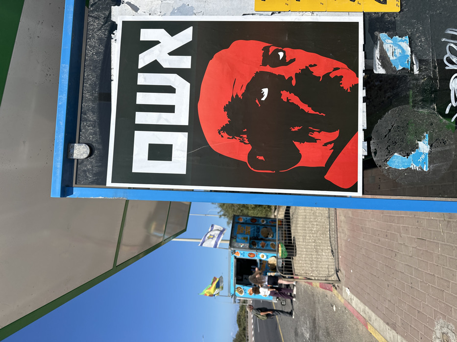 The image captures a sunlit roadside scene in the Hof Ashkelon Regional Council, Israel. In the immediate foreground, a blue-framed public display panel contains a large poster. This poster features a black background with a striking red, stylized depiction of a bald man's head and shoulders, with white, upward-gazing eyes. Above the red figure, prominent white Hebrew text reads "אשם" (Asham), meaning "Guilty." The lower part of the display panel exhibits layers of torn paper and graffiti. To the left of the display panel, a light blue food truck, adorned with various food images, is parked along an asphalt road. A galvanized metal barrier separates the truck from a reddish-brown brick sidewalk. Three individuals are visible near the food truck: an older man in a grey shirt stands to the left of the truck, while two younger individuals, one in a white top and dark shorts and another in a dark top, are positioned directly in front of the service window, appearing to engage with the vendor. In the mid-ground, behind the food truck, two flags fly from poles against a clear blue sky. The Israeli flag, featuring a blue Star of David on a white background, is clearly visible. To its left, another flag with yellow, green, and possibly red bands is partially obscured. Sparse coastal vegetation lines the background beyond the road.