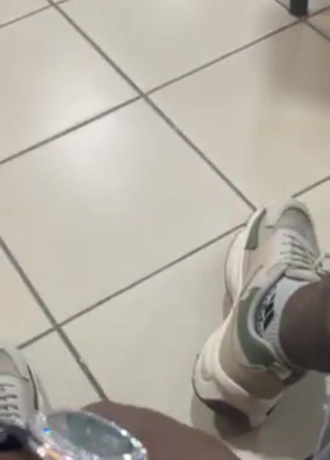 person in a waiting area. They are wearing sneakers and a diamond-encrusted watch. The camera pans up to reveal a sign that reads "SERVICE WEEK 2025 MISSION: POSSIBLE." There is a balloon arch in the colors red, black, and teal decorating the sign. The person is holding documents in their hands.
